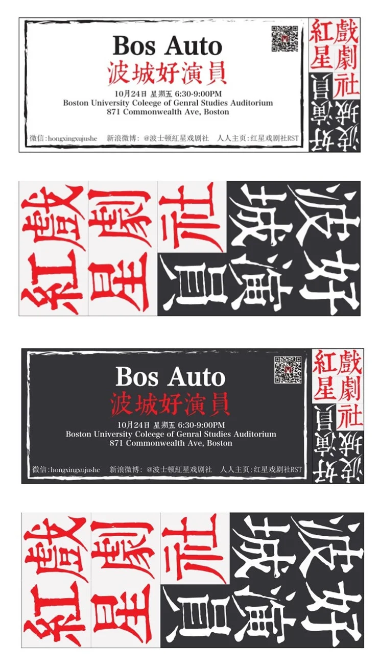 Patterns inspired from Moveable Type appear on both front and back of the ticket. I rearranged the ten Chinese characters, five for "Redstar Theatre Club" and the other five up-side-down for "Boston's best actor/actress" to create playfulness.
