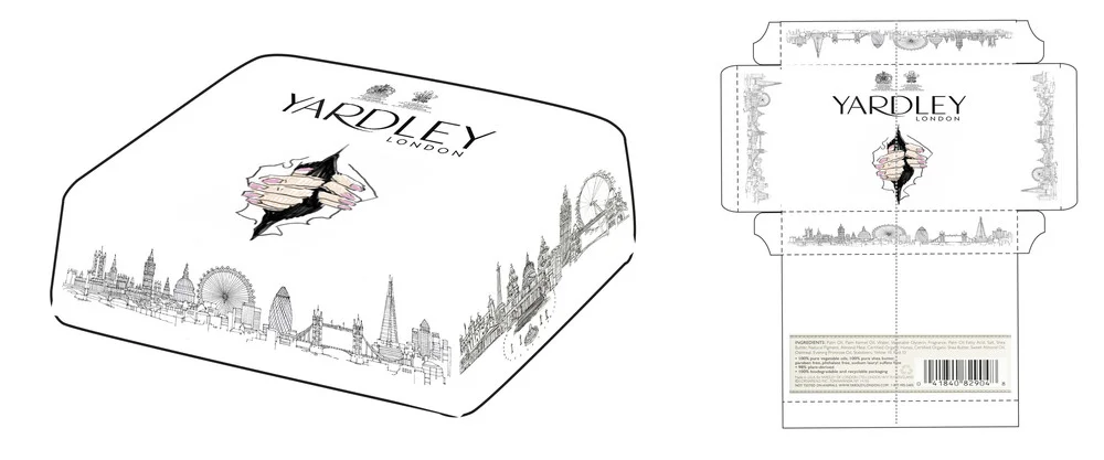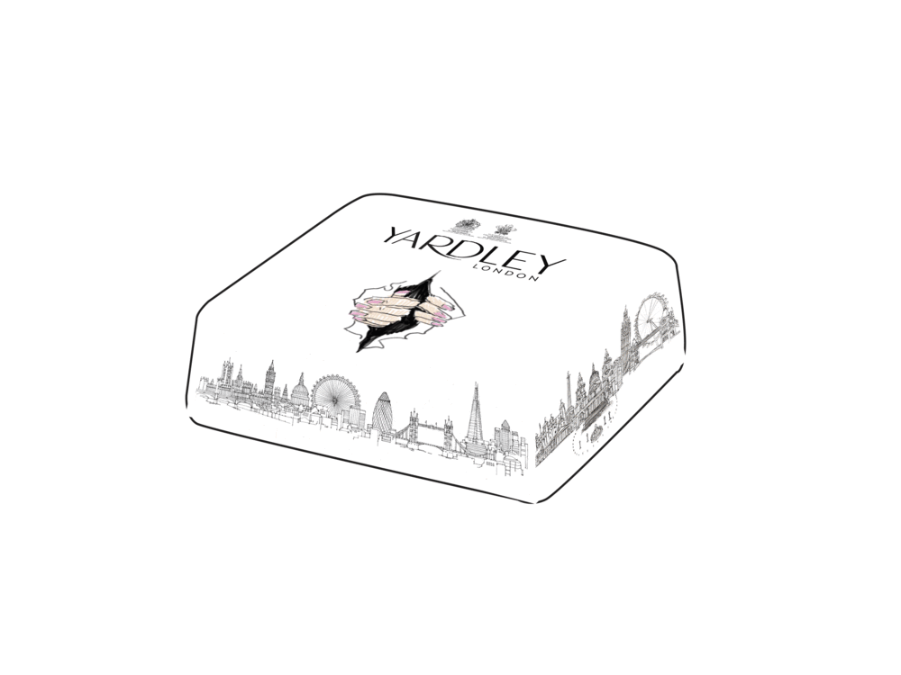 Since our objective is to raise awareness among a younger audience but maintain our original consumers, I designed this new package for Yardley but kept the product the same as before. The new package consists of the original logo of Yardley, a sketch of the London skyline which shows where the soap was born, and a visual of hands tearing the box from inside, representing a new image of Yardley breaking free, especially from chemicals, and coming out of the old perception.